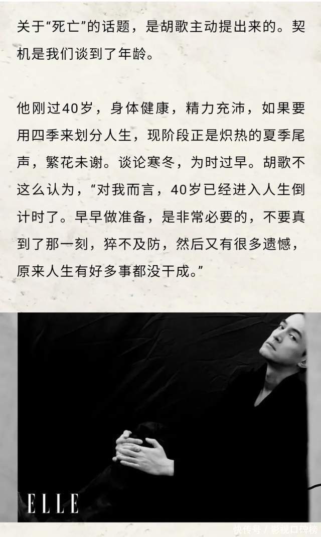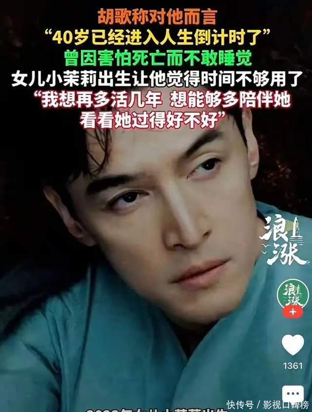 接受某杂志采访的胡歌,被问到了年龄的话题。他说,他认为人过了40岁就是进入了人生倒计时。这话说得有点悲观,后面给出了解释,他看着自己的小姑娘今年才两岁,有些焦虑不能陪伴她长大,感觉自己的时间不够用,坦言说自己想多活几年。做个算术确实如此,胡歌到了60岁,孩子才20岁,有点差了辈分的感觉。